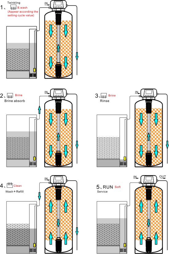 DR softening valve series is upflow regeneration floating bed, the shape and dimensions of DR series valve are identical to those of GR series valve. The floating bed process is achieved by reconfiguring the water flow direction through the lower valve body. This system delivers superior water quality with enhanced adaptability to high-hardness raw water. Thin and high ion exchange vessels is better, flow velocity better with 30-60 m/h3, but resin packing ratio should above 90%, suitable for stable working pressure. The floating bed configuration prohibits frequent start-stop cycling and variable flow demand scenarios.